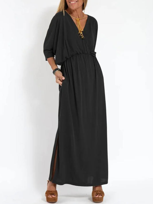 Lässiges, einfarbiges Damenkleid mit V-Ausschnitt und Schlitz
